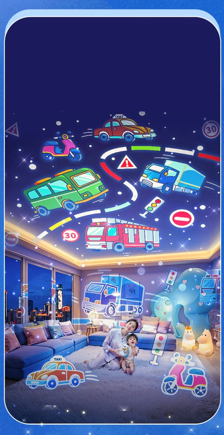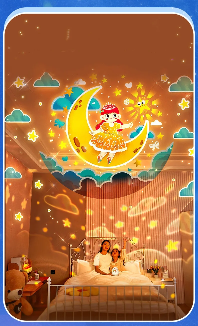 The kids projector night light for kids with 1200mAh built-in battery can be charged by TYPE-C port, power bank or laptop. Once charged, the star projector night light projector can be used for 4-10 hr! The star projector for kids needn't change the 3A battery. Also,u can take this baby night light & star lights for ceiling anywhere CORDLESS.The nightlight for kids room is rechargeable, thus baby can hold the baby night light for baby nursery & star lights for ceiling as sleeping buddy WITHOUT CORD! Make the star projector for kids become the best sleeping partner in yr kid's room! Just take star night light projector & star lights for ceiling home!